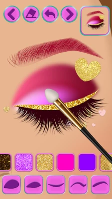 Sukella tee-se-itse-meikkipeleihin tytöille! Ryhdy meikkistylistiksi ja luo upeita glitter-meikkejä. Opi silmämeikkiä askel askeleelta luomiväripaletin ja glitter-eyelinerin avulla. Luo taianomaisia kulmakarvataiteen malleja tässä hauskassa ja opettavassa sovelluksessa.