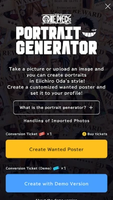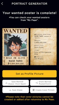 Haluatko astua itse osaksi One Piece -maailmaa? ONE PIECE BASE esittelee ainutlaatuisen One Piece Portrait Generator -toiminnon! Muunna omat tai ystäviesi valokuvat Eiichiro Odan tunnistettavalla tyylillä piirretyiksi muotokuviksi. Tämä innovatiivinen työkalu avaa portit henkilökohtaiseen taiteeseen, jonka avulla voit sitten luoda oman, täysin uniikin etsintäkuulutusjulisteen tai jopa oman manga-luvun kansikuvan, jossa olet itse pääosassa. Anna mielikuvituksesi lentää ja tee itsestäsi osa legendaa Bandai Namco Entertainment Inc:in tarjoamalla ONE PIECE BASE -sovelluksella.